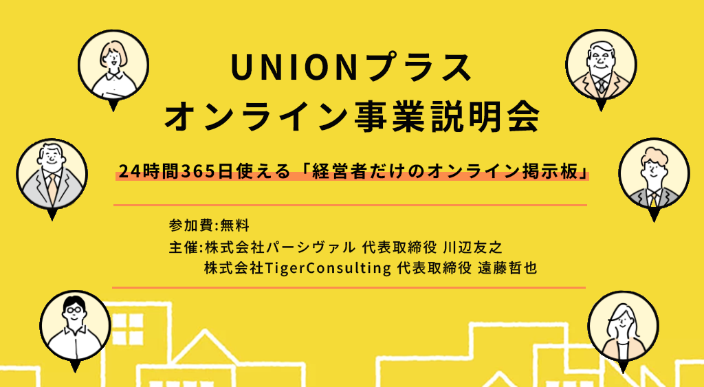 UNIONプラスは、経営者だけが参加できるオンラインの掲示板型マッチングサービスです。全国の代表者同士が、募集・情報交換・相談・協業などのビジネスニーズを気軽に投稿し合い、効率よくつながることができます。招待制・審査制なので安心して利用でき、自動マッチングも可能です。